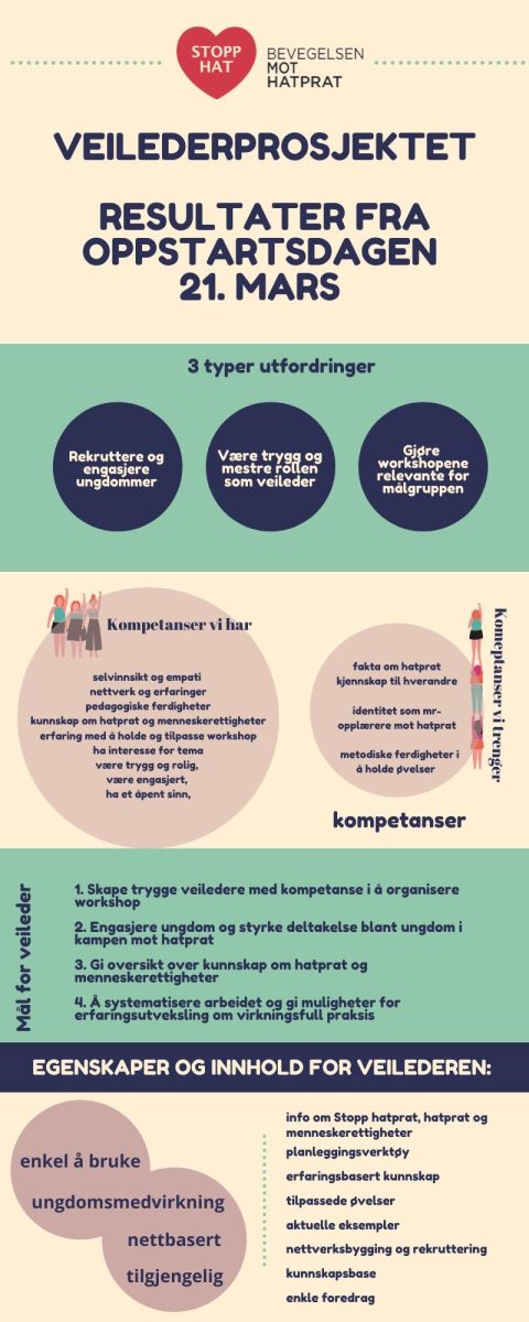 På oppstartsdagen fikk vi gjennom workshop-aktiviteter og gruppearbeid en oversikt over noen grunnleggende utfordringer når det kommer til å bruke menneskerettighetsopplæring i praksis. Vi kartla kompetanser man trenger for å holde workshops. Til slutt utviklet vi mål for hva vi vil oppnå med veilederen og hvordan den kan utformes. Oppsummering fra workshopen følger vedlagt i pdf. format og under som infograph.