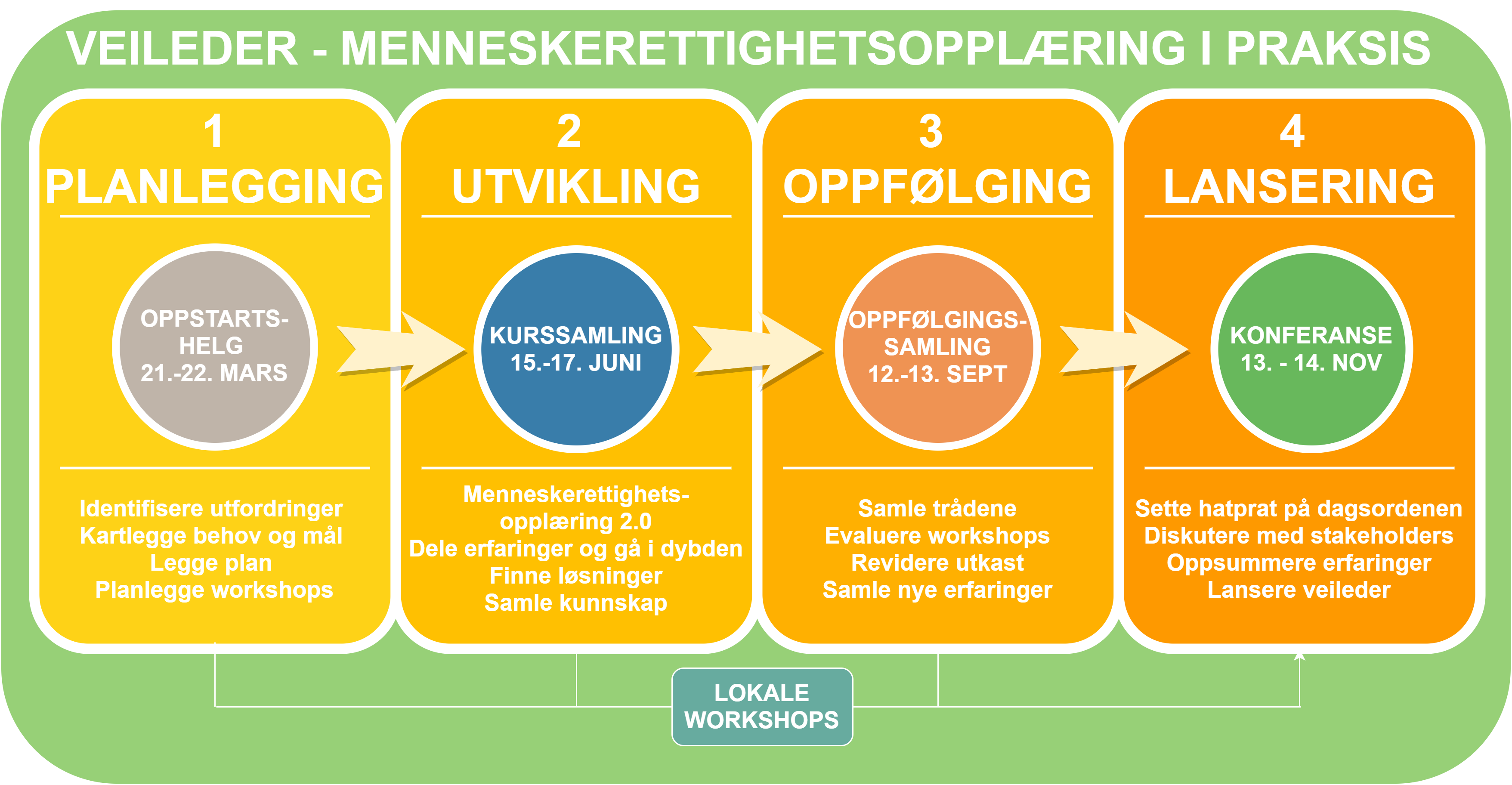 Innhold | Identifisere utfordringer knyttet til hatprat og ungdom og diskutere disse Kartlegge behov og mål for en veileder i menneskerettighetsopplæring mot hatprat | Menneskerettighetsopplæring 2.0. Dele erfaringer med menneskerettighetsopplæring med ungdom og hatprat Gå i dybden på utfordringer og f inne løsninger Samle erfaringer og kunnskap til veilederen Evaluere workshops | Evaluere workshops og prosessen så langt Vise fram utkast til veileder og få tilbakemeldinger Samle nye erfaringer og kunnskap til veilederen | Sette temaet hatprat i arbeid med ungdom på dagsordenen Invitere relevante aktører og diskutere utfordringer og løsninger Oppsummere erfaringene fra 2020 Lansere og introdusere flere for veilederen, spre ordet |